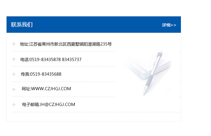 地址:常州市新北區友邦商務大廈1幢16、17層  電話:0519-85101652  傳真:0519-85112595  郵編:213022  網址:www_cz-jiayue_cn.anjinda.com  郵箱:xiajifengaa@163.com